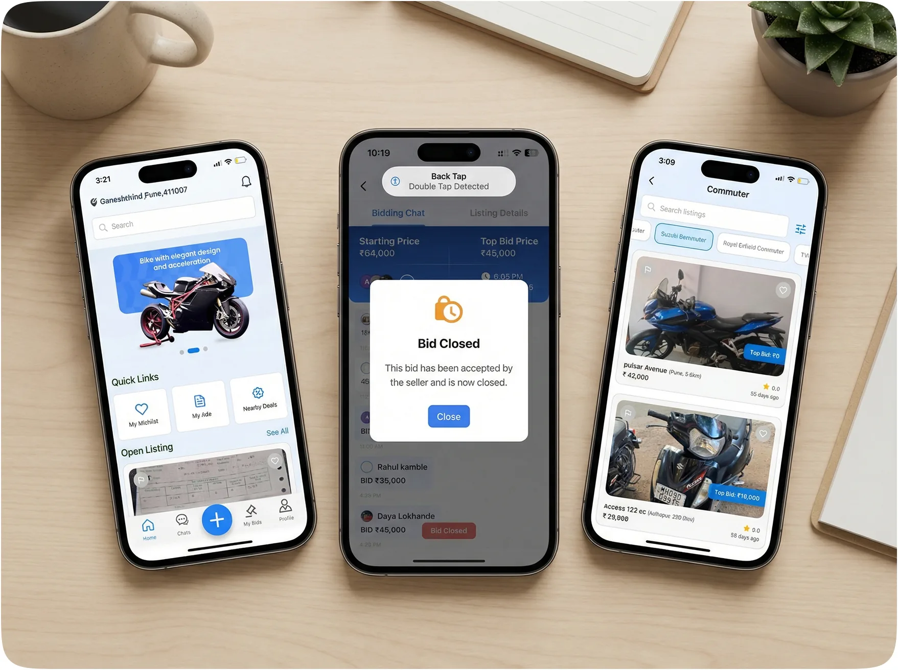A seller lists a bike with a base price. The auction goes live for a set duration. Buyers place bids in real-time, watching the price counter update instantly. When the timer hits zero, the highest bidder wins. A chat window opens, allowing the buyer and seller to arrange a test drive and final payment.